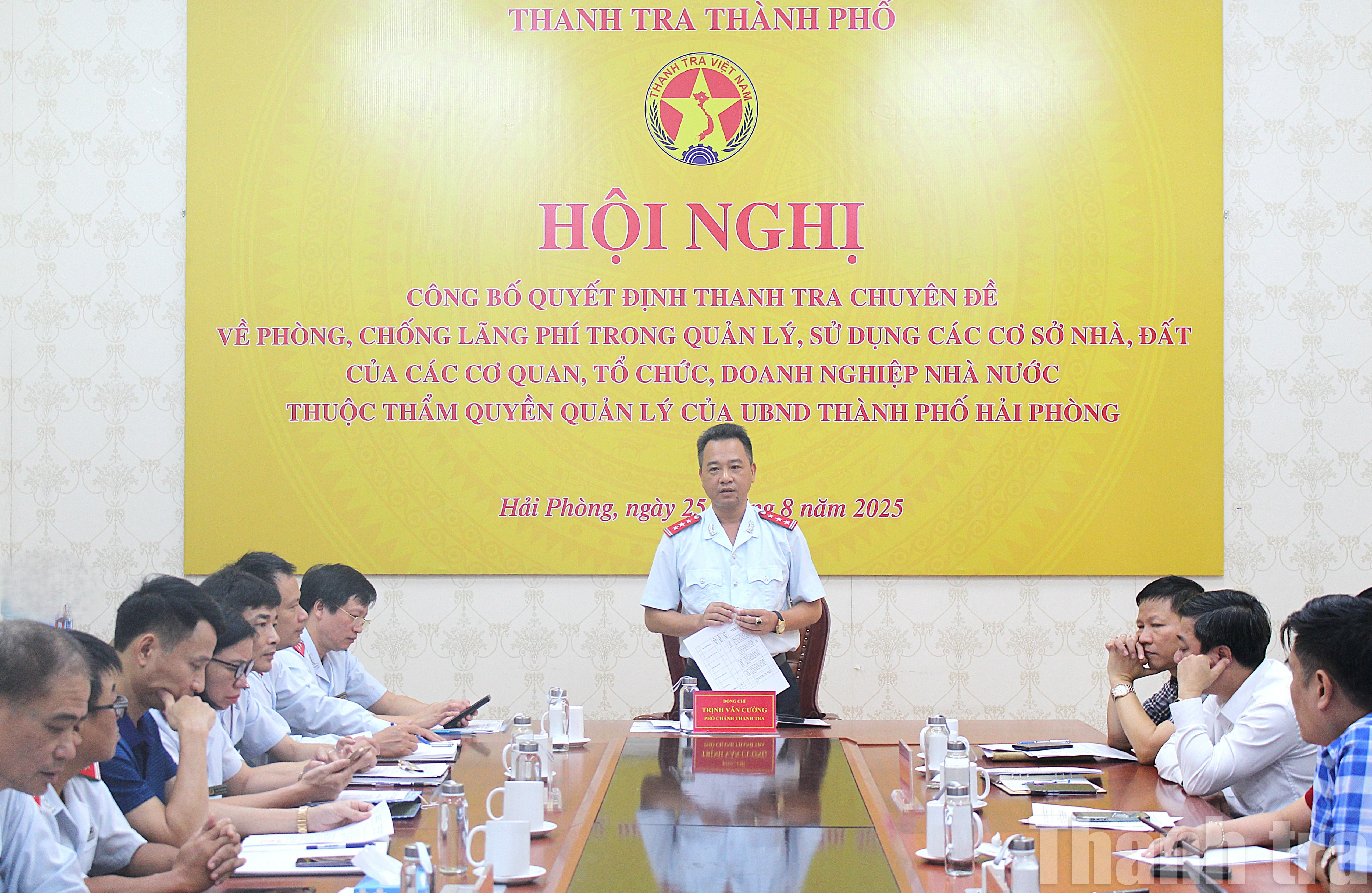 Sáng ngày 25/8, tại trụ sở Thanh tra thành phố Hải Phòng, Phó Chánh Thanh tra thành phố Trịnh Văn Cường đã chủ trì buổi công bố quyết định thanh tra chuyên đề về phòng, chống lãng phí trong quản lý, sử dụng các cơ sở nhà, đất của các cơ quan, tổ chức, doanh nghiệp Nhà nước thuộc thẩm quyền quản lý của UBND thành phố Hải Phòng.