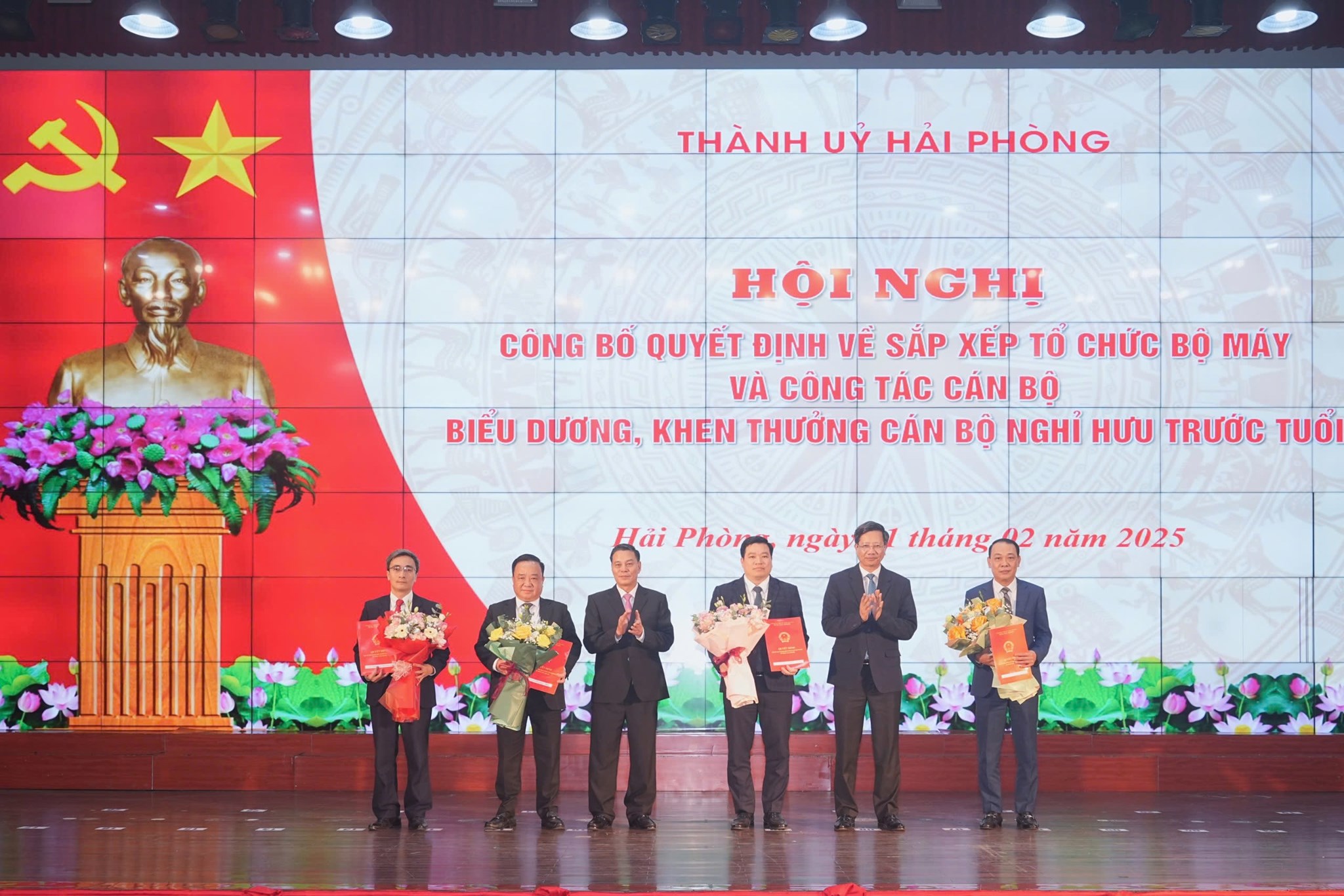 Chiều 21/2/2025, Ban Thường vụ Thành ủy tổ chức Hội nghị công bố quyết định về sắp xếp tổ chức bộ máy và công tác cán bộ của hệ thống chính trị thành phố; gặp mặt, biểu dương cán bộ nghỉ hưu trước tuổi khi thực hiện sắp xếp, tinh gọn tổ chức bộ máy vì sự nghiệp phát triển của thành phố Hải Phòng. Đồng chí Lê Tiến Châu, Ủy viên Trung ương Đảng, Bí thư Thành ủy, Trưởng Đoàn ĐBQH thành phố Hải Phòng chủ trì Hội nghị.