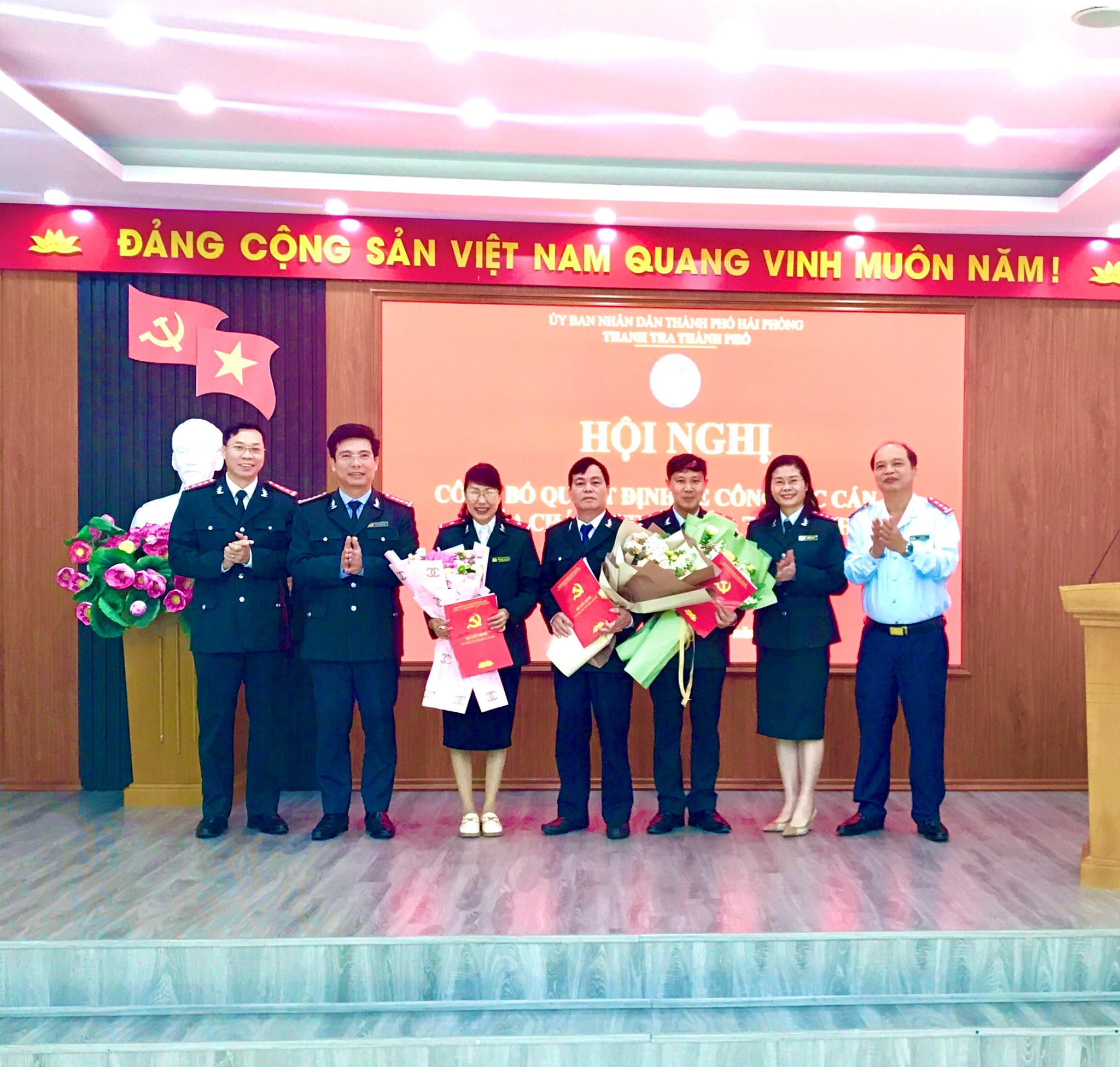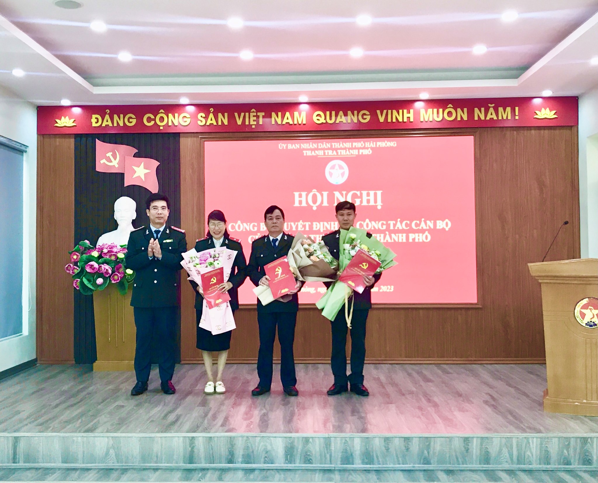 Tại hội nghị, tập thể lãnh đạo Thanh tra thành phố tặng hoa và chúc mừng các đồng chí Đoàn Ngọc Thưởng, Trương Thị Nhàn, Lê Văn Sở và mong muốn trên vị trí công tác mới các đồng chí sẽ phát huy trí lực, chung sức, đồng lòng cùng tập thể cán bộ, công chức cơ quan Thanh tra thành phố đoàn kết, tiếp nối được sự phát triển mạnh mẽ của Thanh tra thành phố trong thời gian qua.