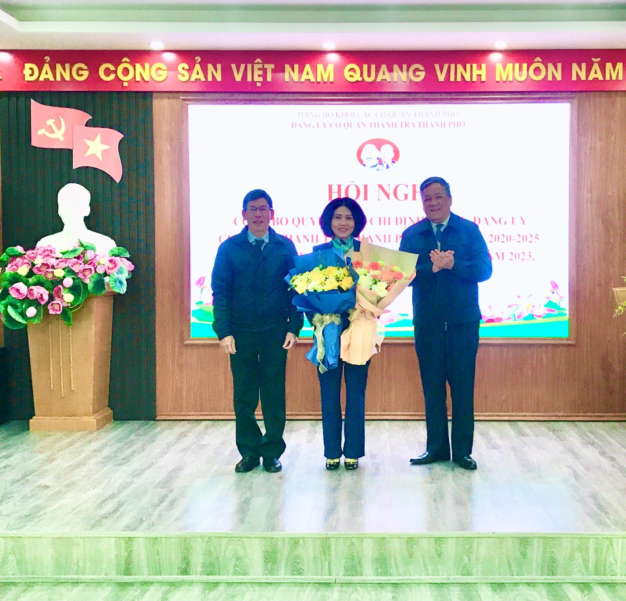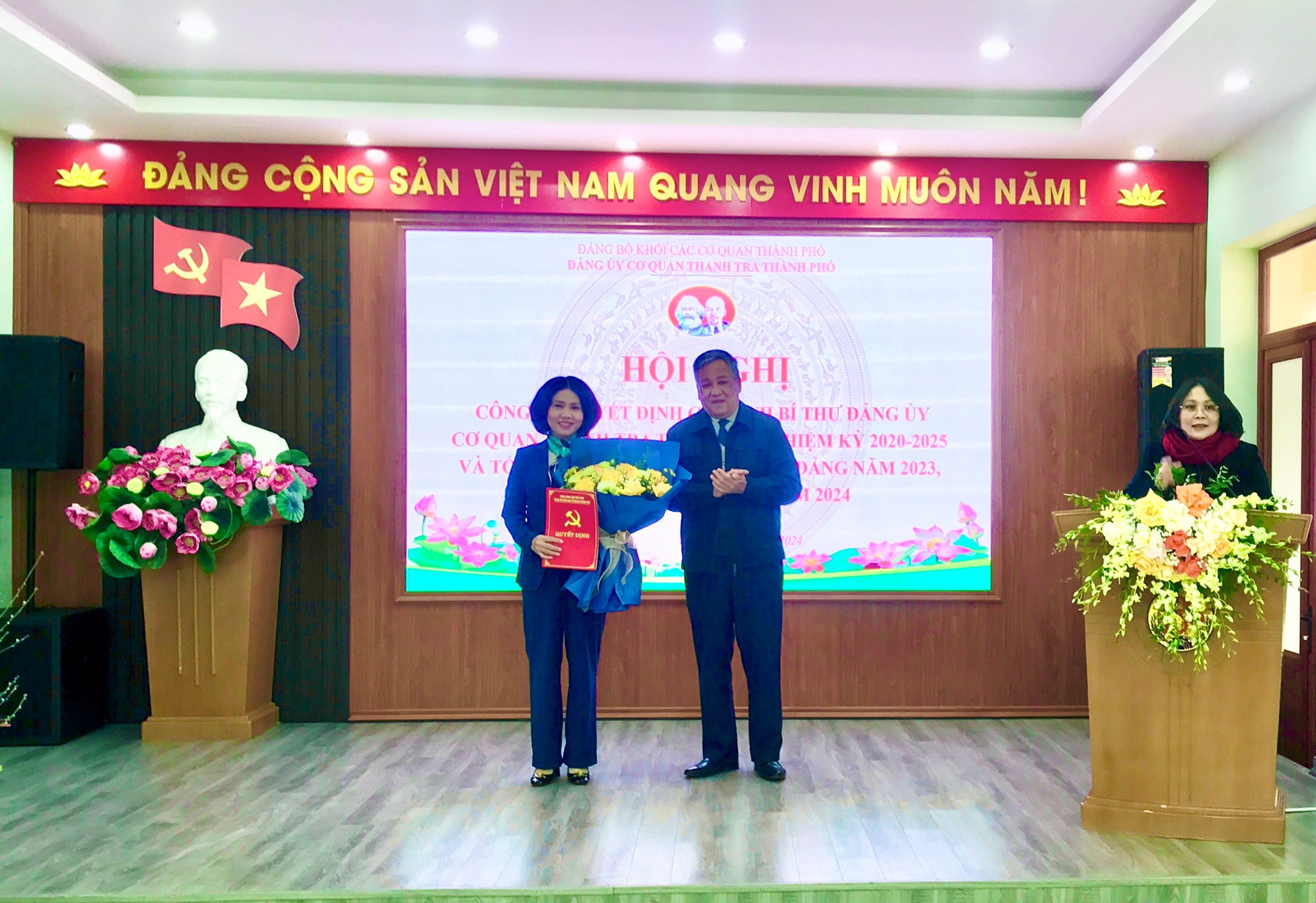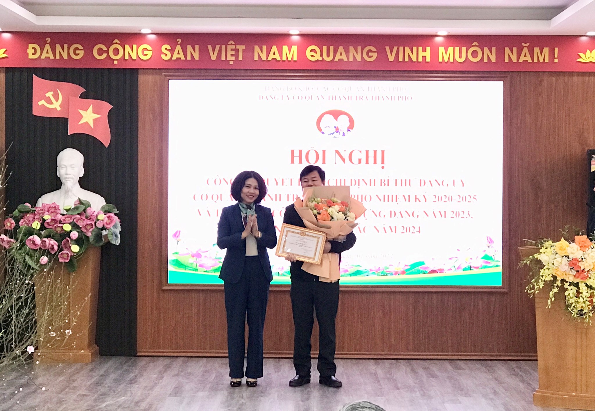 Đồng chí Phạm Xuân Thanh- Ủy viên Thành ủy, Bí thư Đảng ủy Khối các cơ quan thành phố trao quyết định và chúc mừng đồng chí Bùi Thị Hồng Vân giữ chức vụ Bí thư Đảng ủy cơ quan Thanh tra thành phố nhiệm kỳ 2020-2025
