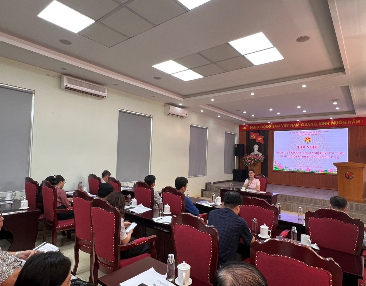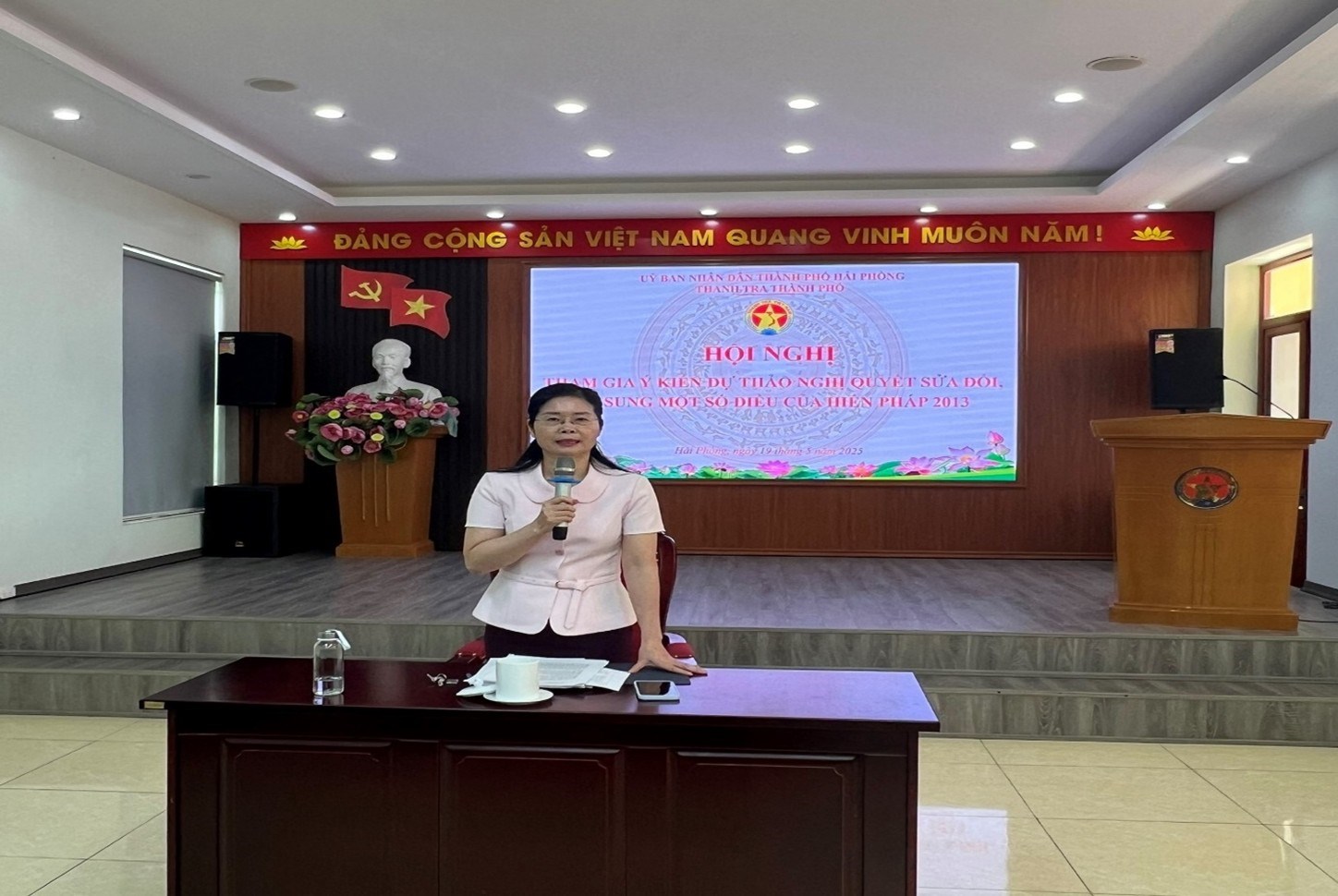 Thực hiện Kế hoạch số 113/KH-UBND ngày 09/05/2025 của Ủy ban nhân dân thành phố và Công văn số 45/CV-HLG ngày 08/5/2025 của Hội Luật gia thành phố Hải Phòng về việc tổ chức lấy ý kiến Nhân dân, các ngành, các cấp về dự thảo Nghị quyết sửa đổi, bổ sung một số điều của Hiến pháp 2013, chiều ngày 19/5/2025, Thanh tra thành phố đã tổ chức hội nghị với thanh tra các sở, ngành, quận, huyện, thành phố Thủy Nguyên về việc lấy ý kiến tham gia dự thảo Nghị quyết sửa đổi, bổ sung một số điều của Hiến pháp 2013.